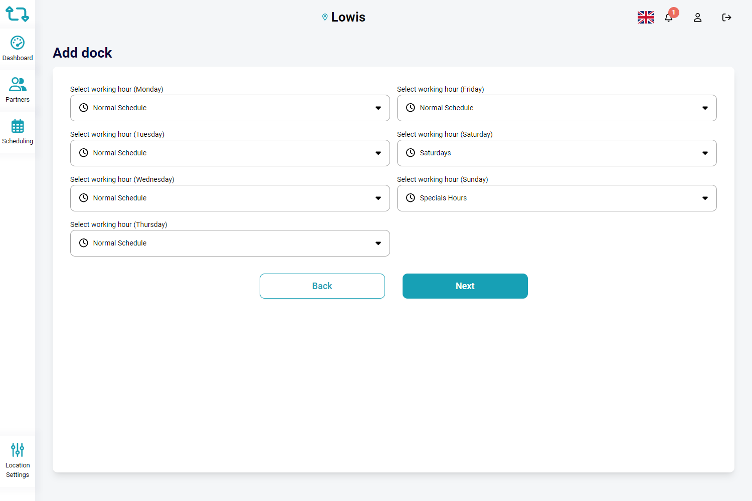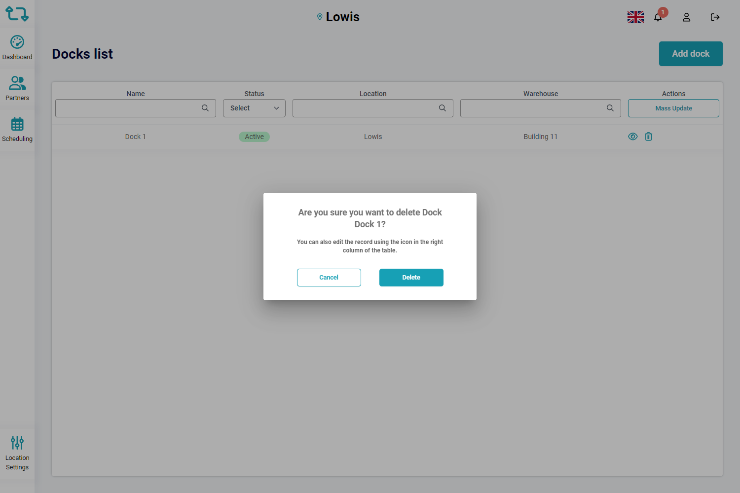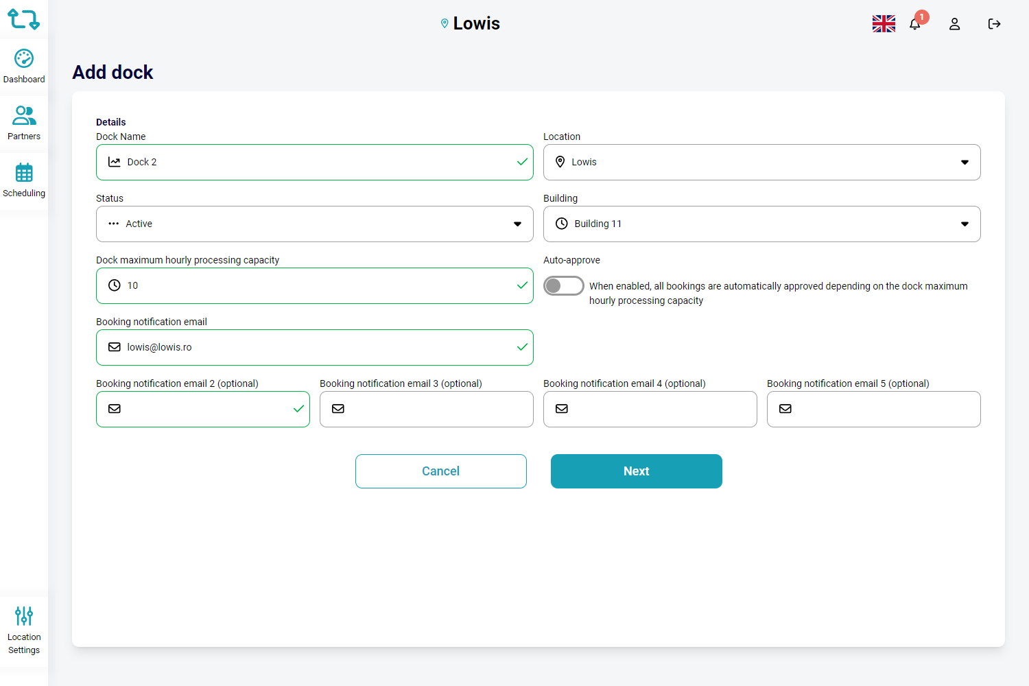 Docks There is the possibility that in certain locations or areas (halls, warehouses, buildings), several loading/unloading ramps may operate, which is why the application allows defining them. The steps are as follows: Add Dock Click on Location ...